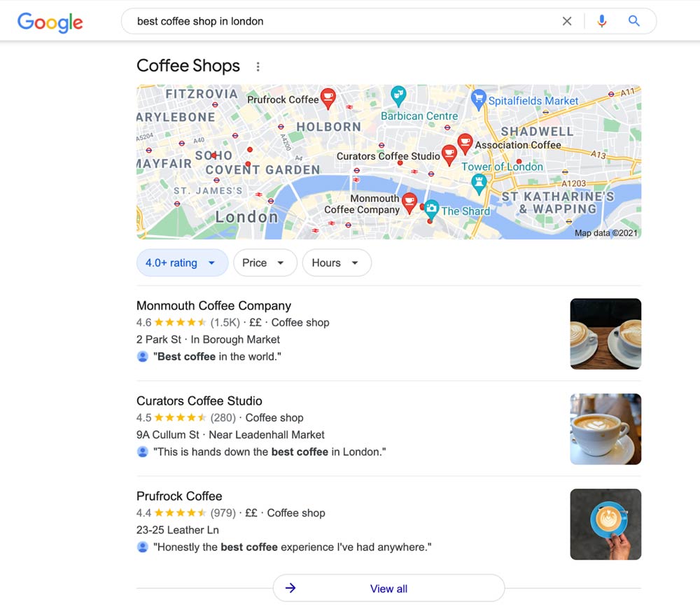 - Increase your Google reviews and ratings. Many Google reviews and an excellent average rating are essential if you want to be featured in local search results. In April 2021, Google launched the product review update making the content of reviews a ranking factor. This means that businesses with more quality, in-depth reviews are favoured3What creators should know about Google’s product reviews update https://developers.google.com/search/blog/2021/04/product-reviews-update.