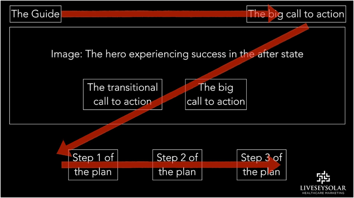 You can see an example of where we’d place a transitional call to action on the front page in the schematic below (Figure 1). We advise our clients to do something similar on every page of their website.