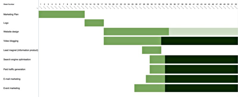The dark green bars indicate where a project continues with iterations. For example, the video blogging doesn’t stop (typically) for another 26 to 52 weeks after it launches in Week 34 (the week of August 6th), because posts go out either biweekly or weekly after that date. An SEO and blogging project continues on a monthly cycle of new content additions and optimisations. The paid traffic generation continues every month with optimisations to ad buying campaigns. E-mail marketing continues indefinitely as new subscribers get lead magnets. Event marketing continues on a monthly basis as we plan new events, promote them, and debrief them.